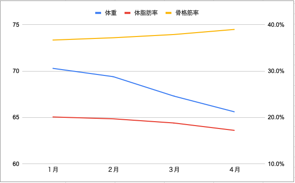 平均週1~2回の運動で体重は4.7kg減、体脂肪率は2.9%減と絞りながら、骨格筋率は2.3%増という結果です。